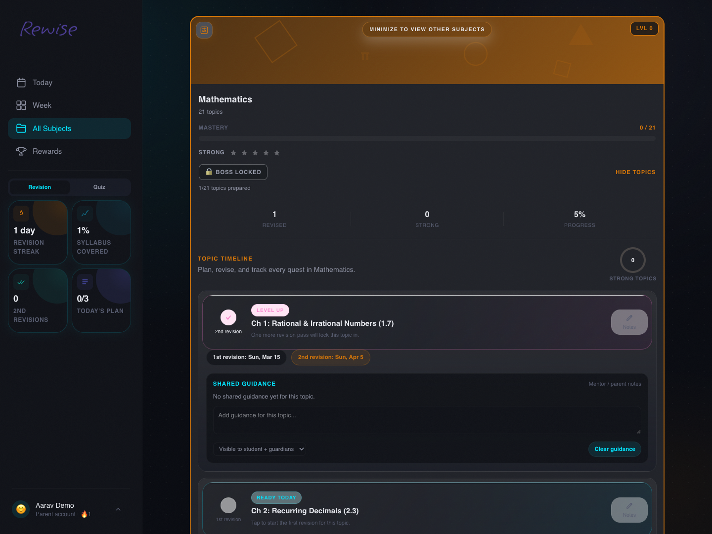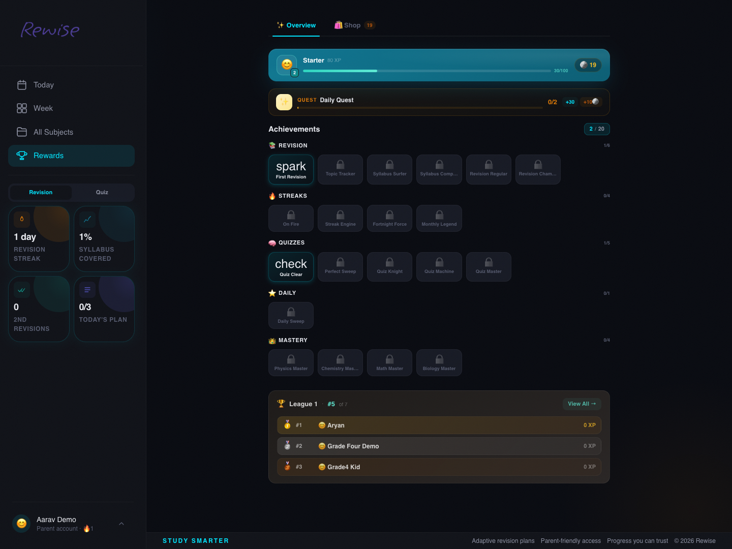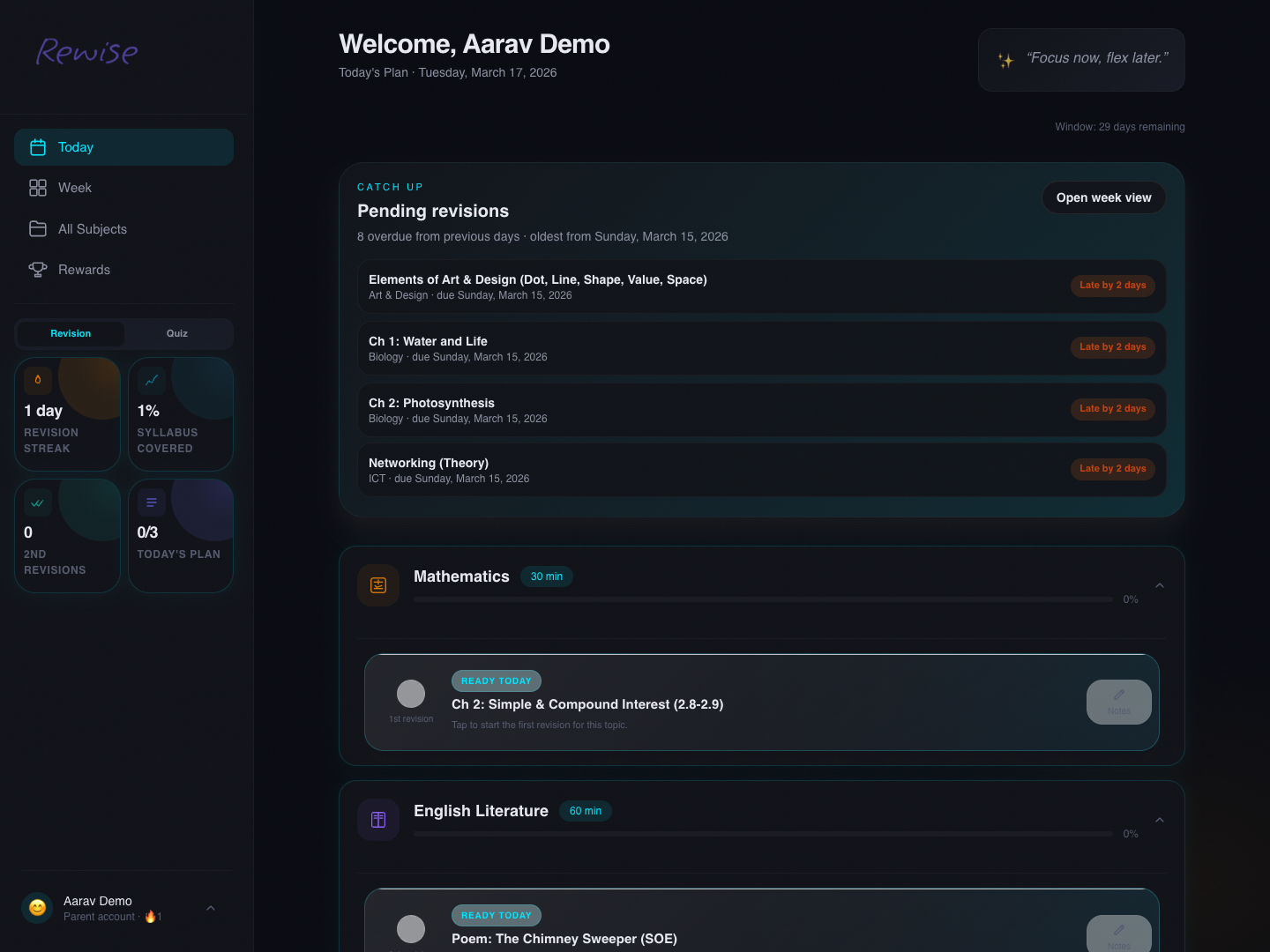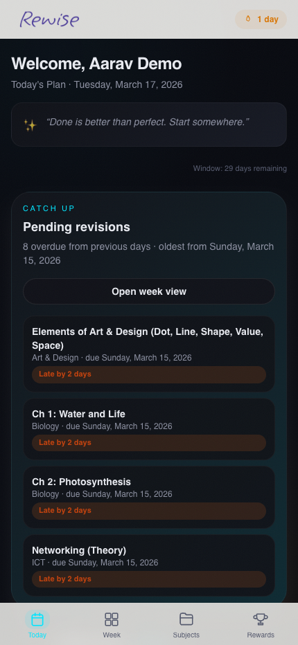 Rewise is a branded revision platform for structured study programs, especially where parents want proof of progress and operators want tighter control over onboarding. Students get a day-by-day revision plan, subject drilldowns, adaptive topic quizzes, rewards, catch-up guidance, and a polished mobile-friendly experience.