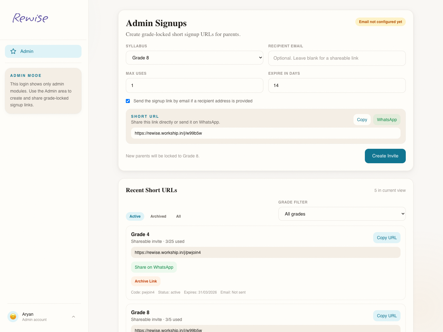 Parents can monitor progress, enable PIN-based verification before revisions are marked complete, review summaries, and optionally invite read-only observers or mentors. Admins can generate grade-locked short signup URLs, manage invite lifecycle, and control how families enter the product.